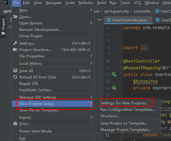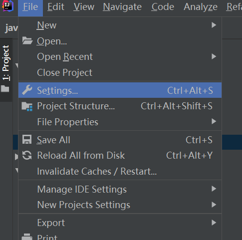 在IDEA工作去上方菜单找到File,下拉选择Setting