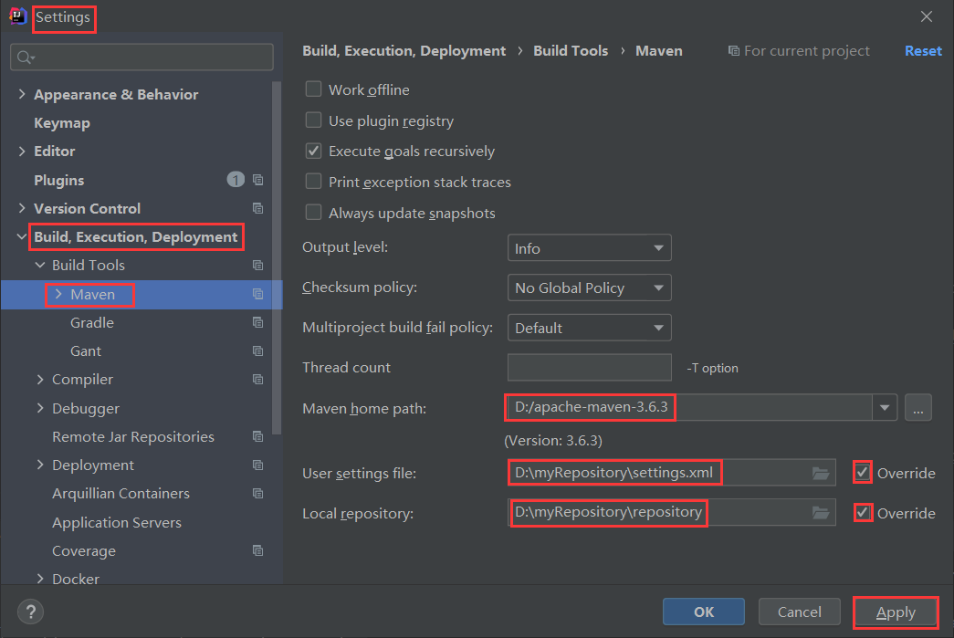 勾选 Local repository 后面的 Override,并指定本地仓库的地址