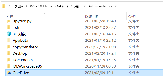 2. 自动同步的OneDrive文件夹,默认路径为C:\用户\\[用户名],如下图所示。