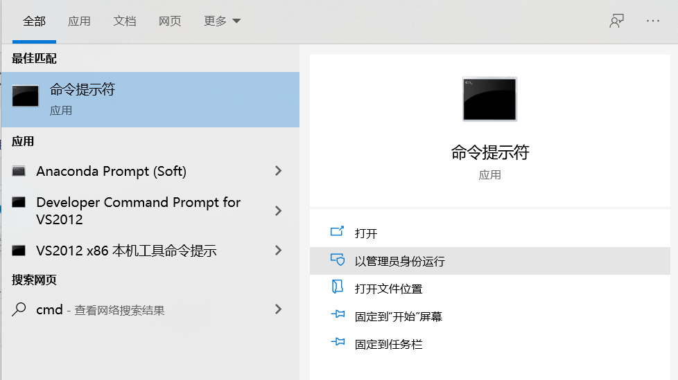 首先,摁下Windows键,输入cmd,选择“命令提示符”,并选择“以管理员身份运行”。