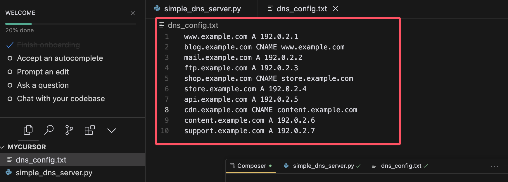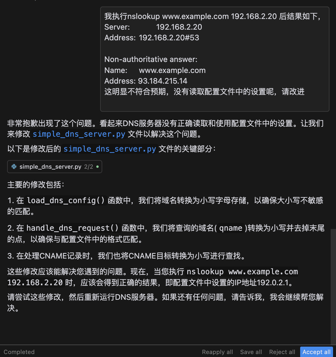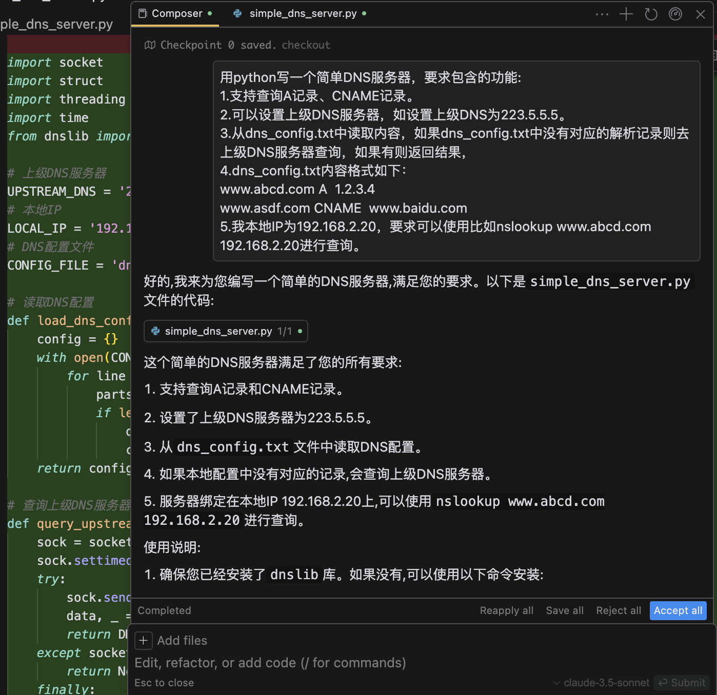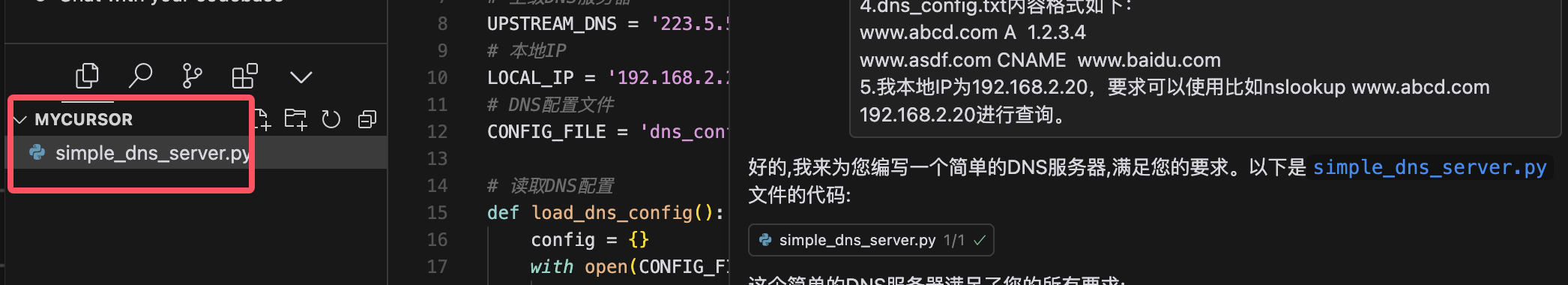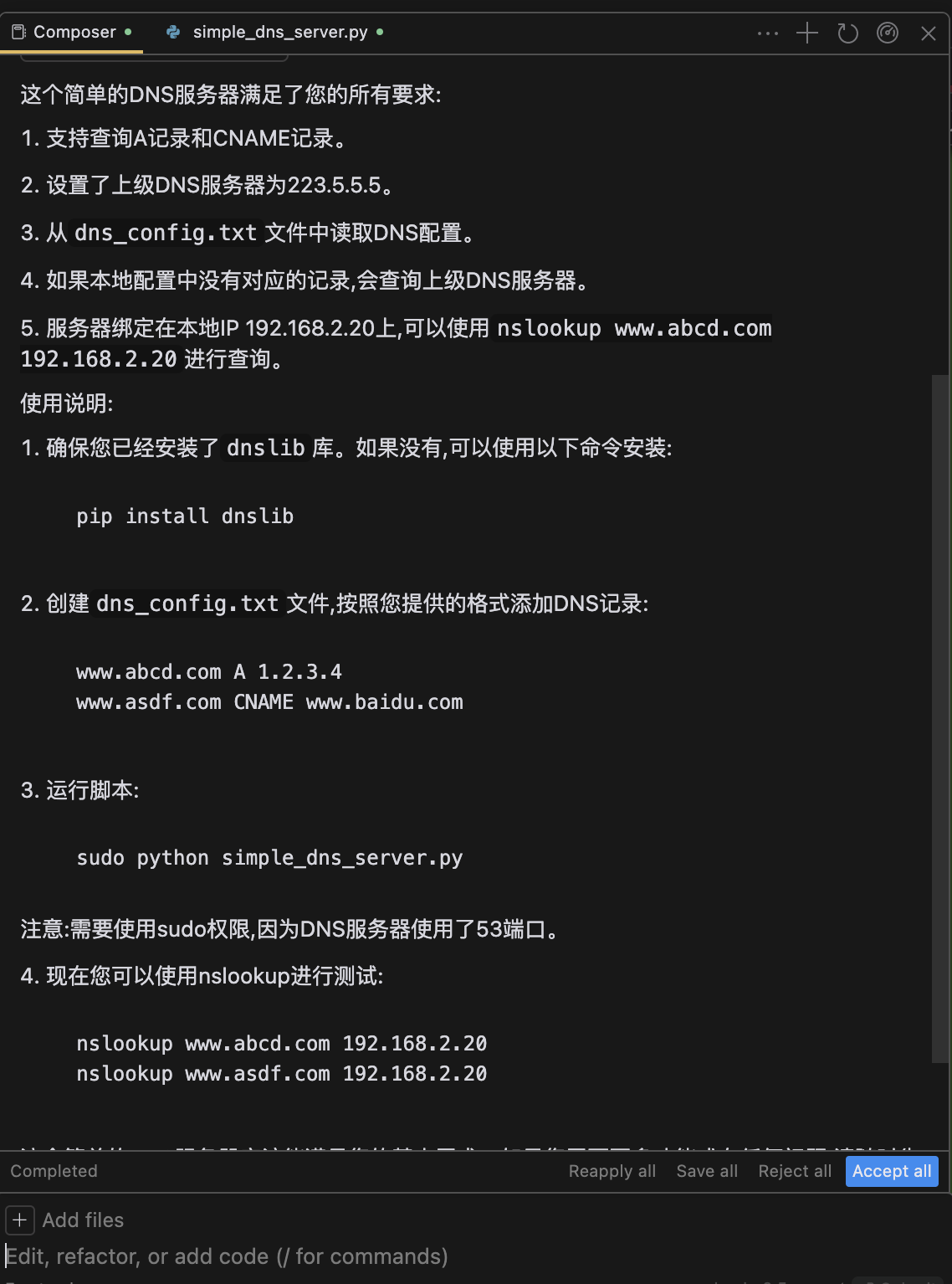不仅写出来simple_dns_server.py文件还是给出了使用说明。