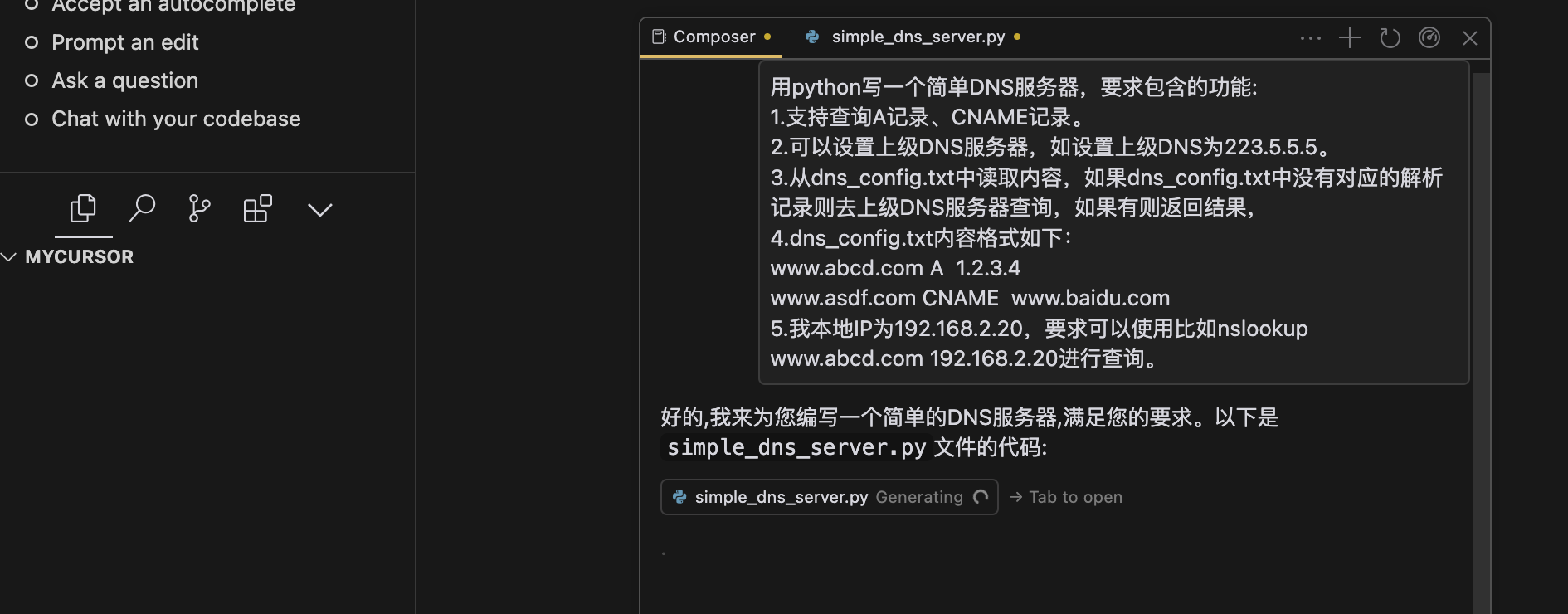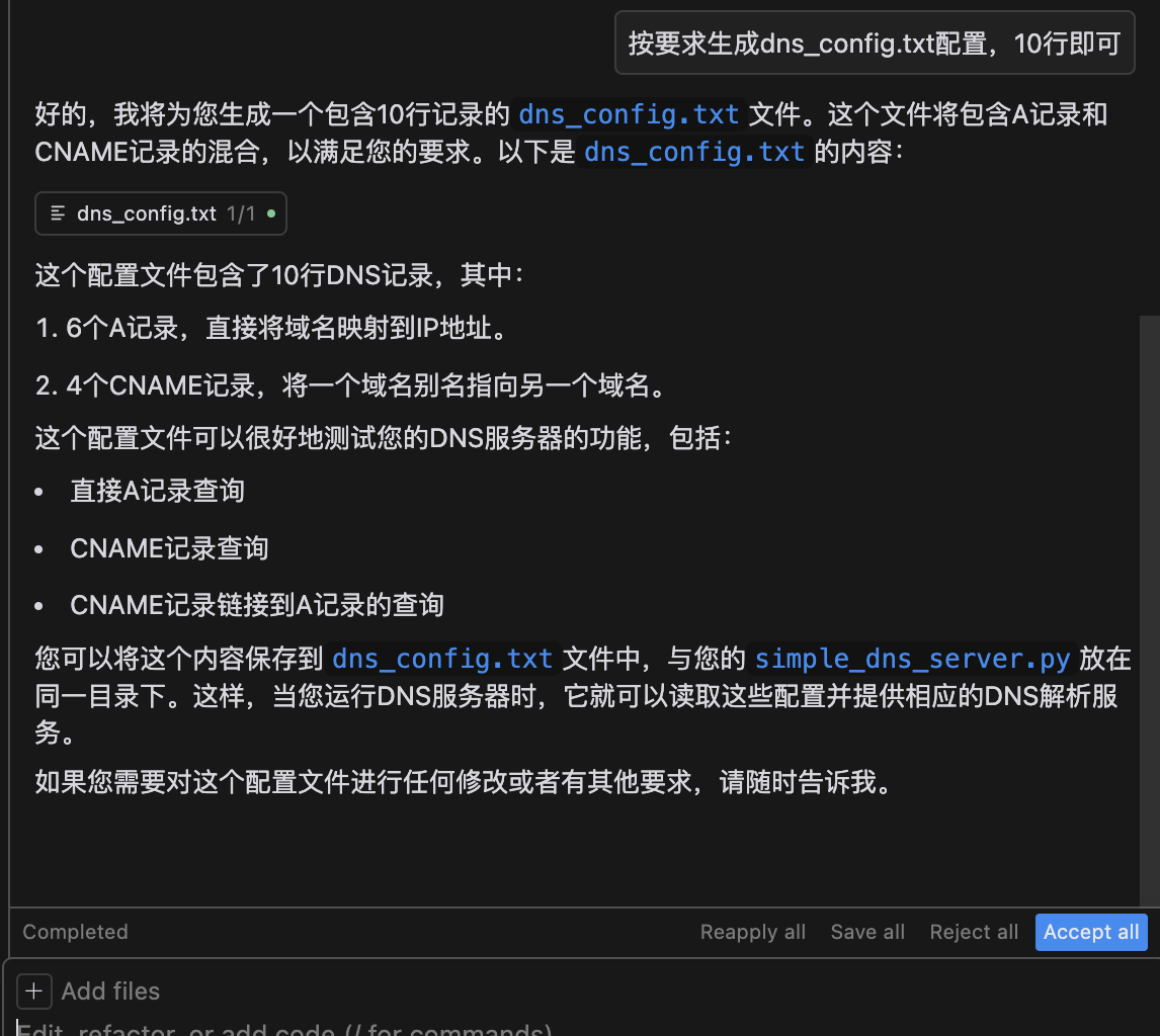 接下来让他帮忙生成dns_config.txt配置