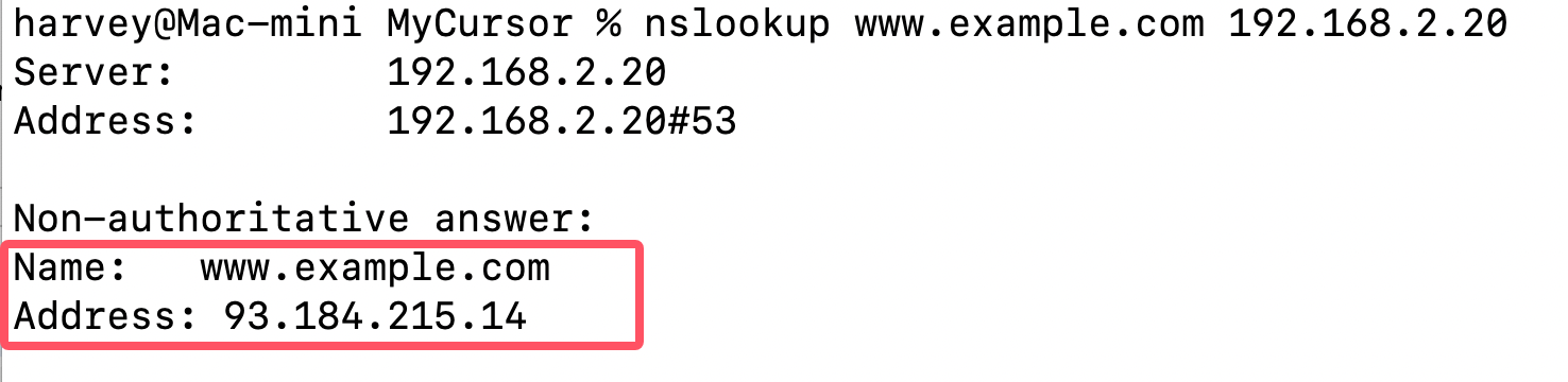 按照配置文件dns_config.txt中的配置www.example.com A 192.0.2.1 应该查询的结果为192.0.2.1才符合预期,我们来试试