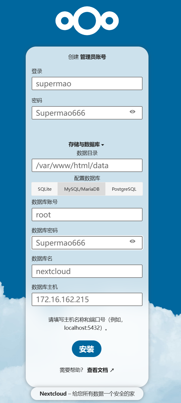 [root@program1 mnt]# docker run -d --name mariadb -e MYSQL_ROOT_PASSWORD=Supermao666 -e MYSQL_DATABASE=nextcloud -p 3306:3306 -v /opt/db:/var/lib/mysql mysql:5.7