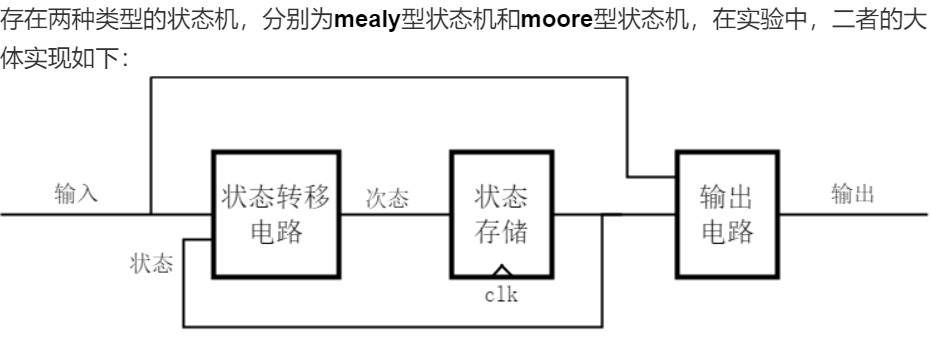 存在两种类型的状态机,分别为mealy型状态机和moore型状态机,在实验中,二者的大体实现如下:
