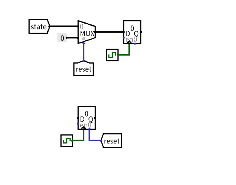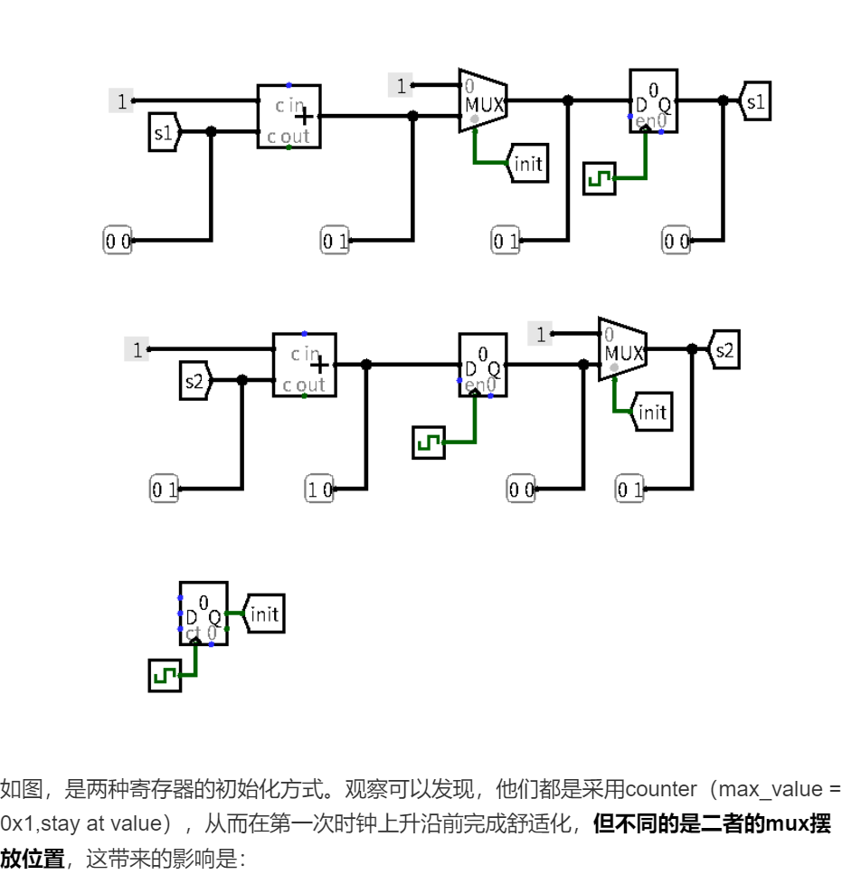如图,是两种寄存器的初始化方式。观察可以发现,他们都是采用counter(max_value = 0x1,stay at value),从而在第一次时钟上升沿前完成舒适化,但不同的是二者的mux摆放位置,这带来的影响是: