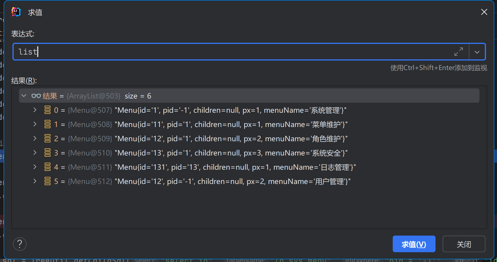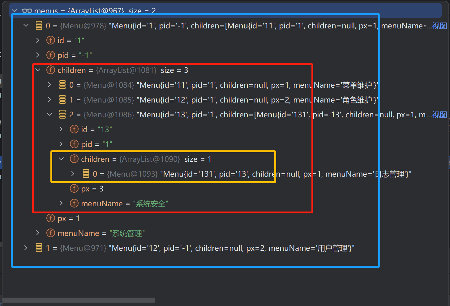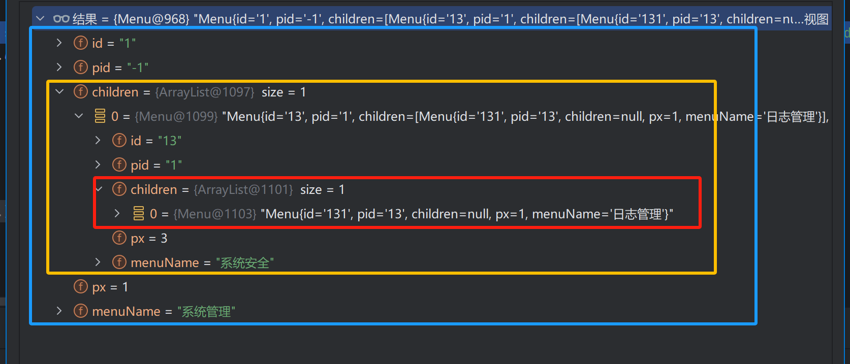 Menu{id='1', pid='-1', children=[Menu{id='13', pid='1', children=[Menu{id='131', pid='13', children=null, px=1, menuName='日志管理'}], px=3, menuName='系统安全'}], px=1, menuName='系统管理'}
