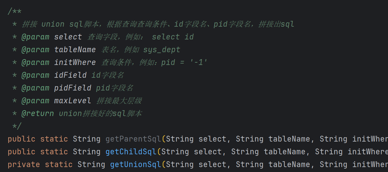 拼接 union sql脚本,根据查询查询条件、id字段名、pid字段名,拼接出sql