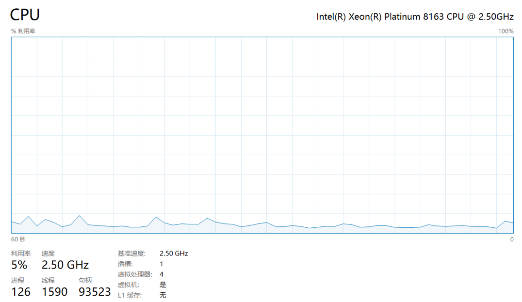服务器 CPU (Intel Xeon Platinum 8163 / 4 核 2.5 GHz) 占用稳定约 5%: