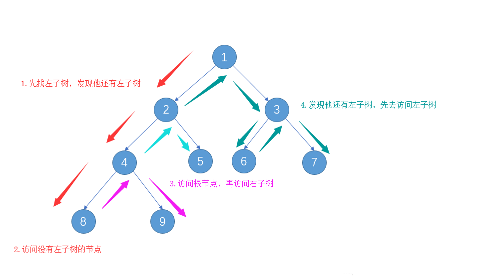 从根结点出发,一直向左子节点走,直到左子节点不存在然后返回到上一个节点走这个节点的右子节点,然后一直往右子节点走,同样的也是走不通为止就返回。很显然这种一路走到黑,黑了就回头的方式,就是深度优先遍历的过程。