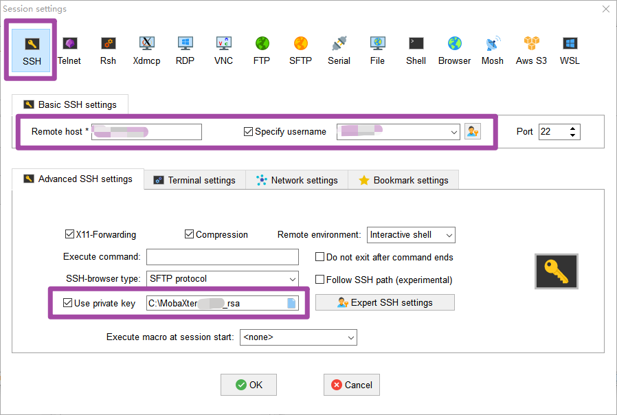 随后,在弹出的窗口中,按照服务器的实际情况,配置服务器的连接信息即可。如下图所示,我这里因为是基于老师给的服务器私钥(id_rsa文件)连接学校的普通服务器,所以就选择SSH连接即可。如果是通过SSH连接,那么就需要配置好“Remote host”(服务器IP地址),“Specify username”如果有的话就填上;随后,如果通过私钥连接服务器,那么就勾选中“Use private key”这个选项,并选择自己的私钥文件。
