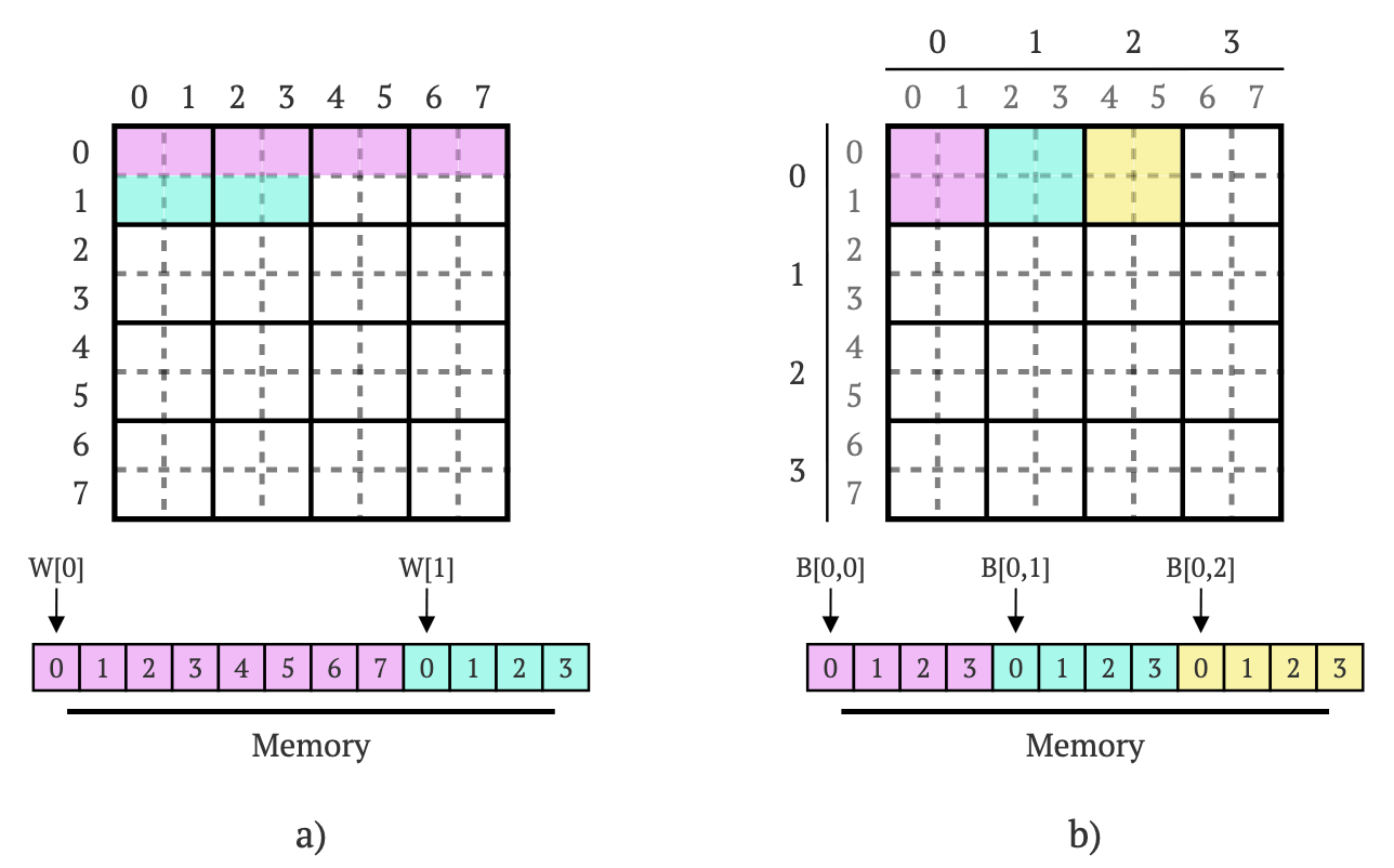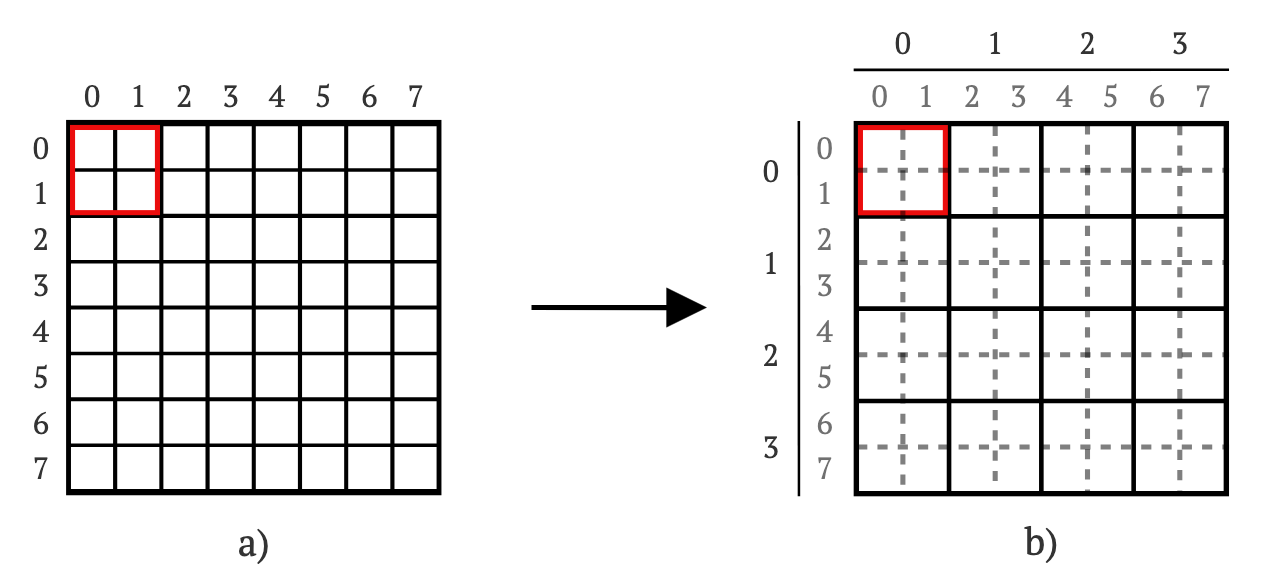 想象一个8×8的权重矩阵W(见图1a)。我们将矩阵分成2×2的块,创建一个新的4×4块矩阵B(见图1b)。