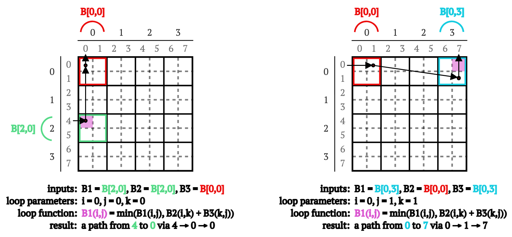 图4. 作为重新计算B[2,0]和B[0,3]块的一部分,计算通过顶点0的4 → 0路径(左)和通过顶点1的0 → 7路径的示意图。