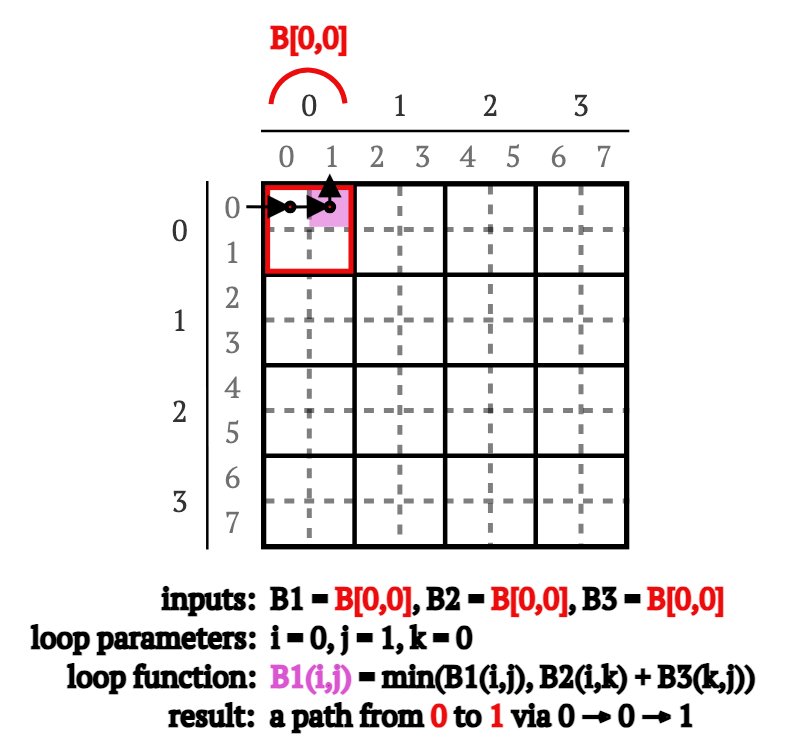 图5. 作为重新计算B[0,0]块的一部分,计算通过顶点0的0 → 1路径的示意图。