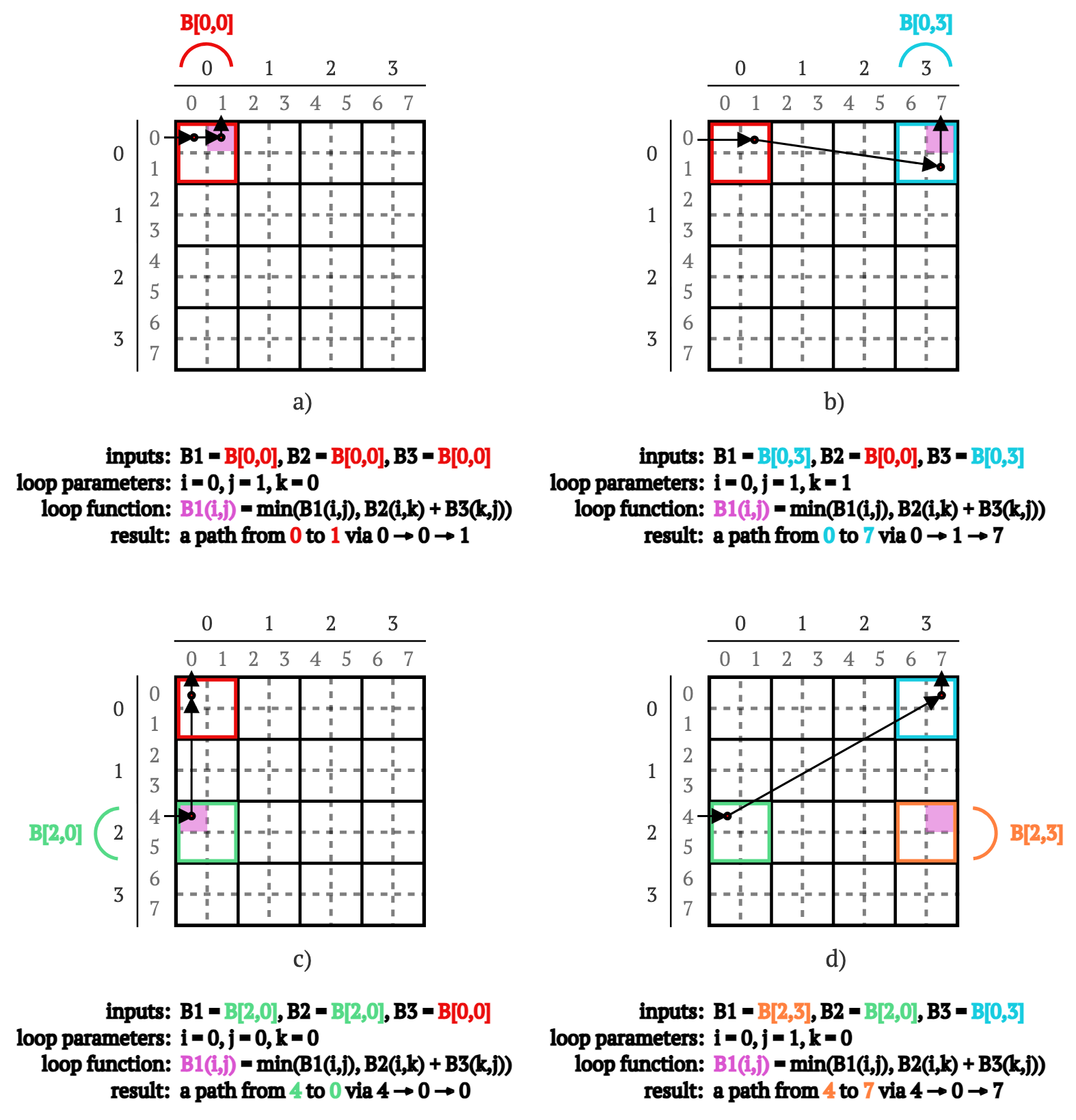 幸运的是(再次),在重新计算B[2,0]和B[0,3]块中的路径之前,我们可以使用...相同的Procedure但(再次)使用不同的输入参数来重新计算B[0,0]中的路径(见图5):