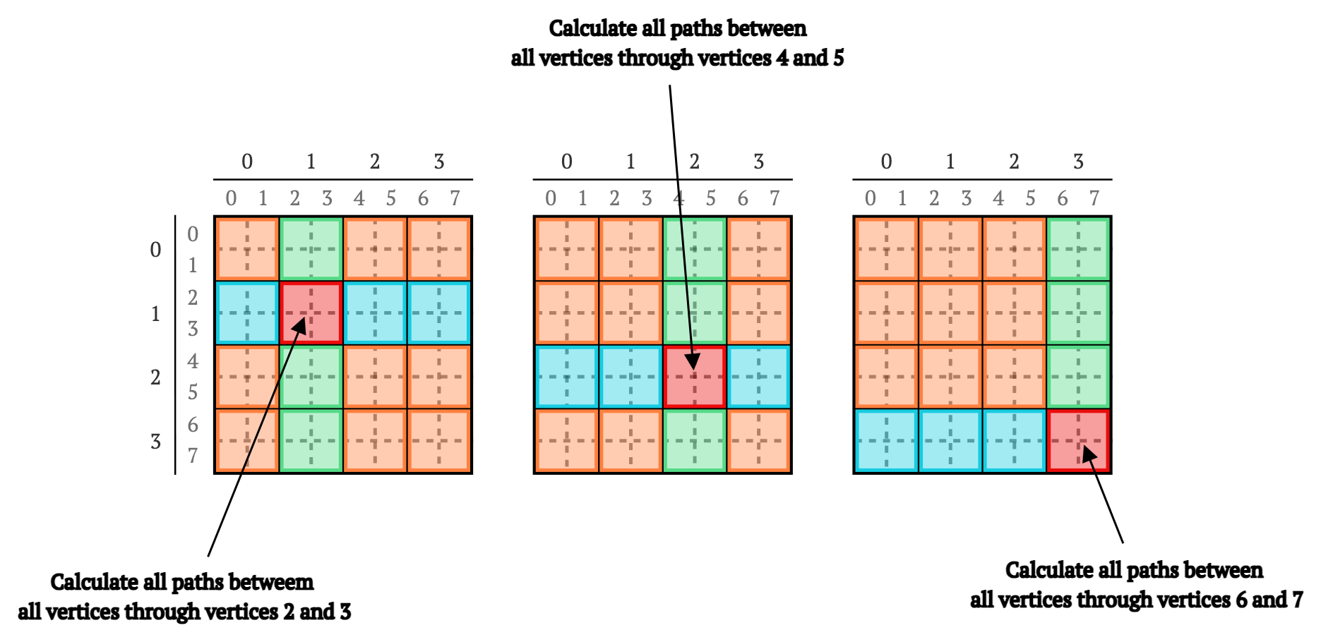 B1 = B[2,0],B2 = B[2,0]和B3 = B[0,0]调用Procedure。这重新计算了从顶点4,5到0,1通过0和1的所有路径。B1 = B[0,3],B2 = B[0,0]和B3 = B[0,3]调用Procedure。这重新计算了从顶点0,1到6,7通过0和1的所有路径。