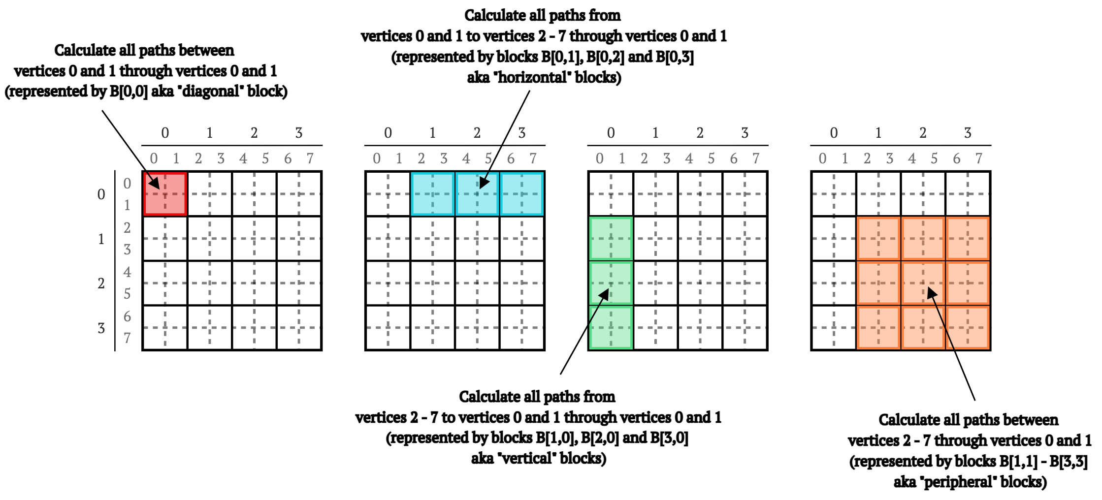 这里的重要一点是,虽然Procedure确实重新计算了从顶点4,5到顶点6,7的路径(通过0和1),但这些路径并不能保证是最短的,因为重新计算依赖于存储在块B[2,0]和B[0,3]中的现有路径。