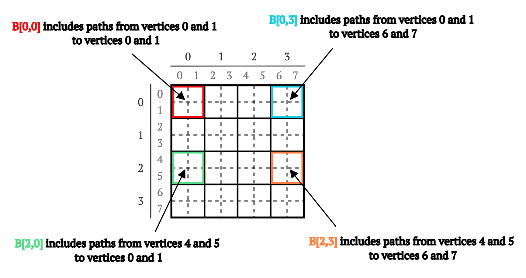 B[0,0]包含从顶点0和1到0和1的路径B[0,3]包含从顶点0和1到6和7的路径B[2,0]包含从顶点4和5到0和1的路径B[2,3]包含从顶点4和5到顶点6和7的路径