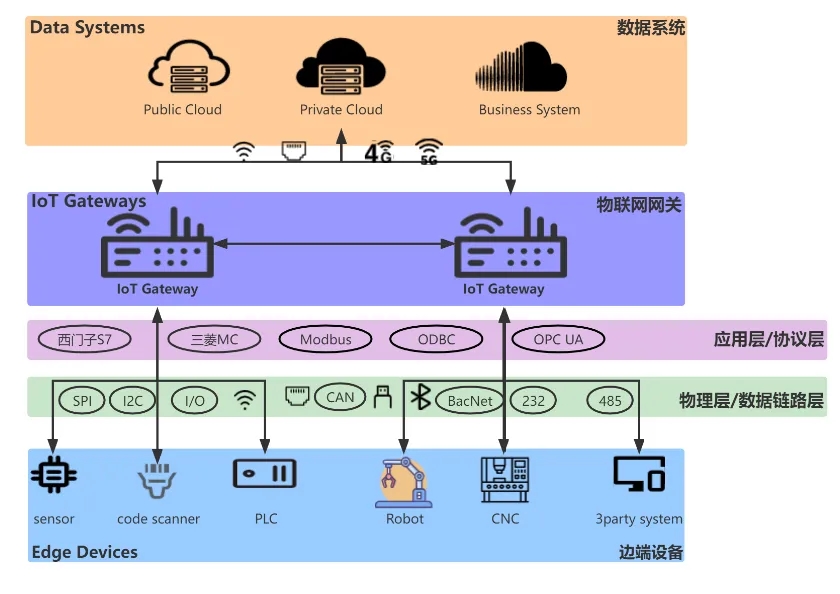 工业物联网网关(IIoT Gateway)是指一种硬件设备或软件程序,它充当着本地设备(例如 PLC、条形码扫描器、机器人、数控机床、定制化的上位机等)与云端系统(如物联网平台、SCADA 系统、MES 系统等)之间的桥梁。