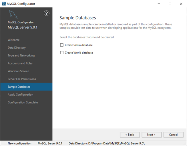 单击【Next】(下一步)按钮,打开创建数据库实例(Sample Databases)窗口,可以勾选创建Sakila、World样例数据库,这里没有勾选,如图1.17所示。