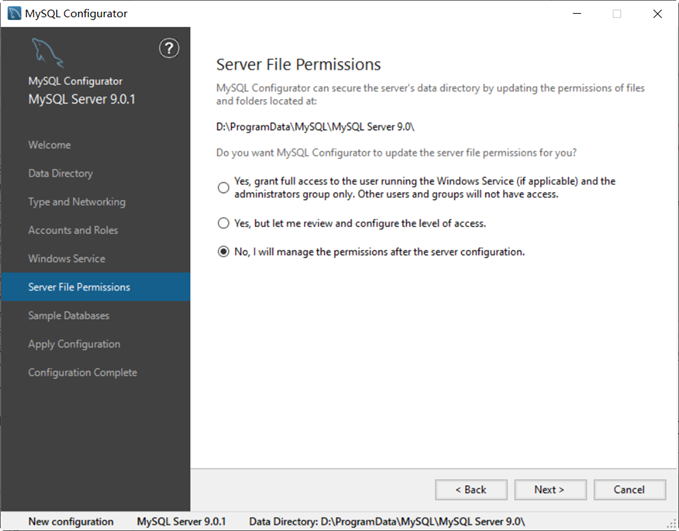 单击【Next】(下一步)按钮,打开服务器文件许可(Server File Permissions)窗口,这里单击第三个单选按钮,如图1.16所示。