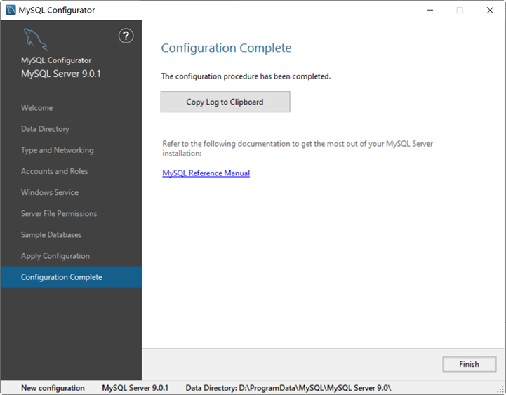 系统自动配置MySQL服务器。配置完成(Configuration Complete)后,单击【Finish】(完成)按钮,即可完成服务器的配置,如图1.19所示。