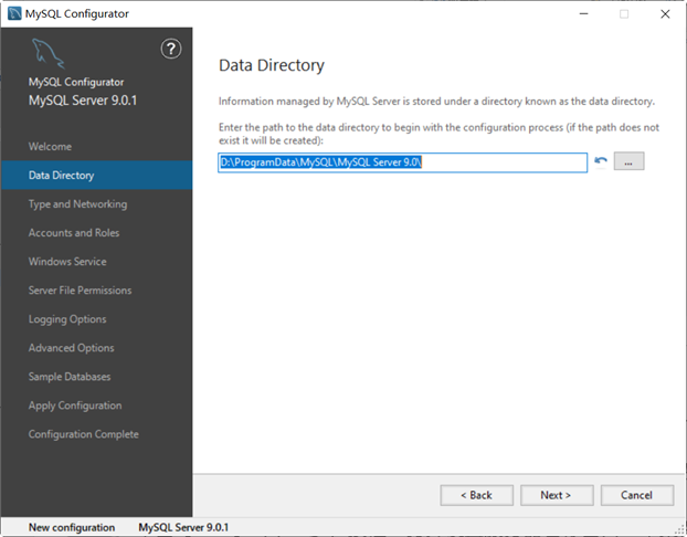 单击【Next】(下一步)按钮,进入设置数据保存路径(Data Directory)窗口,这里可以根据自己的需要设置数据的保存路径,如图1.12所示。