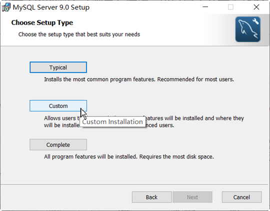 单击【Next】(下一步)按钮,进入选择安装模式窗口。在其中列出了3种安装类型,分别是Typical(典型安装类型)、Custom(自定义安装类型)和Complete(完全安装)。这里单击【Custom】(自定义安装类型)按钮,如图1.6所示。