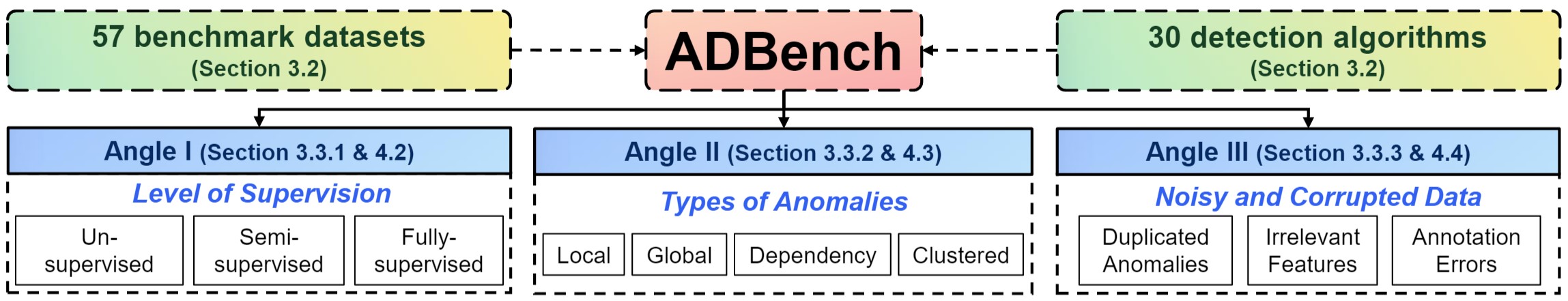 PyOD作者发布了一份长达45页的预印论文,名为ADBench: Anomaly Detection Benchmark,以及提供ADBench开源仓库对30种异常检测算法在57个基准数据集上的表现进行了比较。ADBench结构图如下所示: