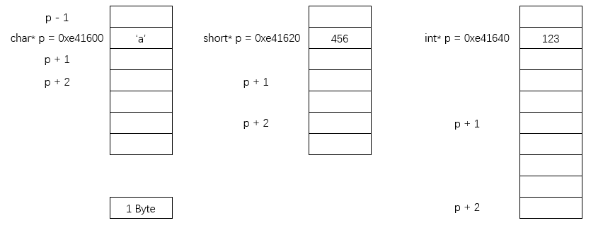 解释如下图:arr数组在内存中占10个Byte,分别定义了三种类型的指针char*, short*, int*并且都指向首地址arr[0],则三种指针的差异体现在两个方面:1、解引用(解析地址)时的偏移量分别为1,2,4个Byte;2、加减时分别以1,2,4个Byte为单位移动地址。