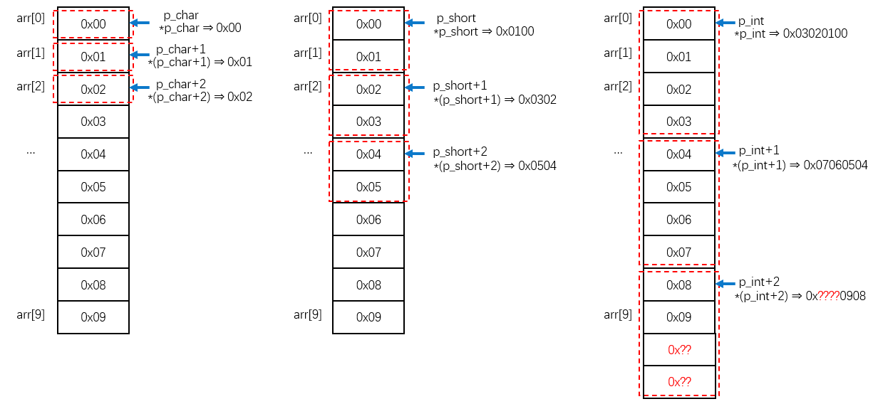 解释如下图:arr数组在内存中占10个Byte,分别定义了三种类型的指针char*, short*, int*并且都指向首地址arr[0],则三种指针的差异体现在两个方面:1、解引用(解析地址)时的偏移量分别为1,2,4个Byte;2、加减时分别以1,2,4个Byte为单位移动地址。