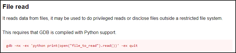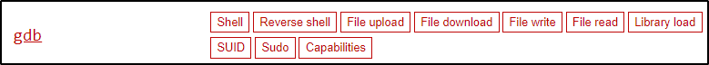 如前所述,当检查gdb二进制文件的 GTFOBins 时,我们可以看到相当多的可用函数。