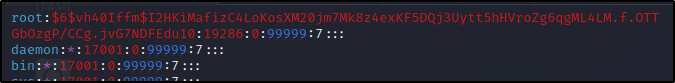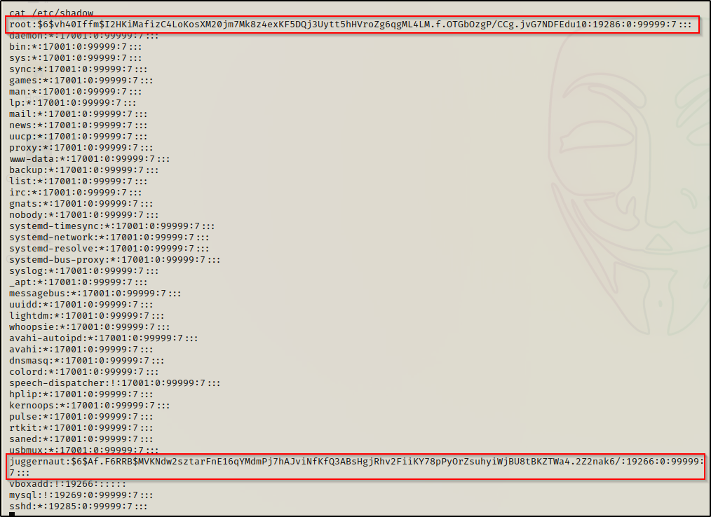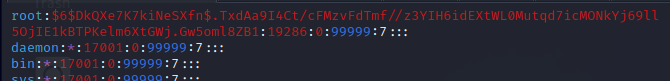 轰!就这样,我们发现自己能够读取影子文件,而作为标准用户,我们本不应该能够读取它。这样,我们现在就可以获取 root 哈希以及我们找到的所有其他用户哈希,并尝试破解它们,以将我们的权限水平提升到另一个标准用户或垂直提升到 root 用户。