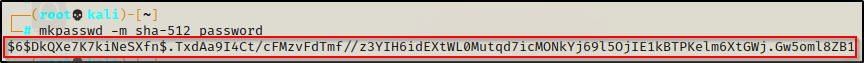 在对影子文件进行任何更改之前,我们需要做几件事。首先,让我们生成一个 SHA-512 哈希来替换为 root 设置的哈希,这将有效地更改 root 密码。为此,我们可以在攻击者机器上使用以下命令生成密码哈希(这会将密码设置为“password”)。