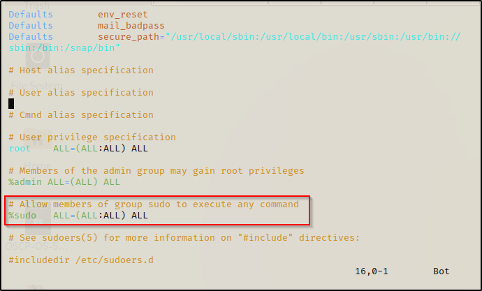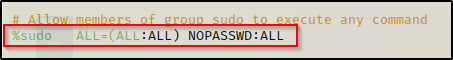 如果我们向下滚动到上面突出显示的行,我们可以添加 NOPASSWD 来绕过密码提示。为此,我们需要首先按“i”键进入“插入”模式,然后编辑该行,如下所示: