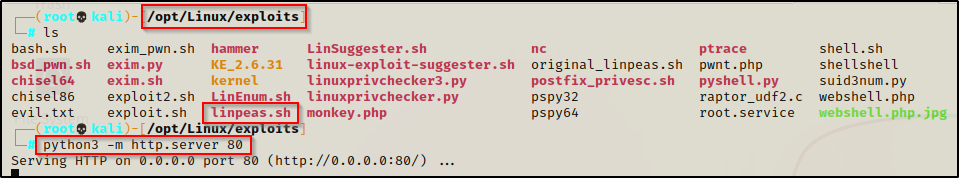 首先,我们需要从linpeas.sh所在的目录在攻击者的机器上设置一个 HTTP 服务器。