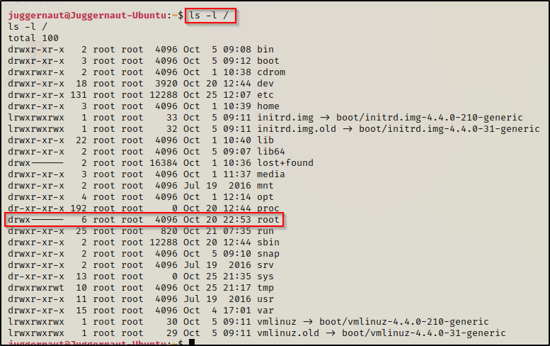 此外,上面的代码片段显示我们无法使用 root 组权限访问 root 文件夹。这是因为 root 文件夹根本没有设置任何组权限。