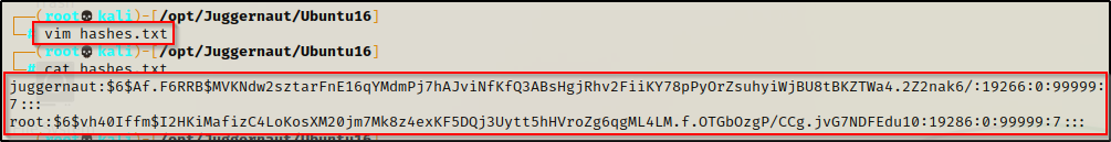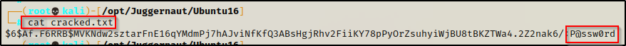 检查我们将输出重定向到的 “cracked.txt” 文件,我们可以看到我们已经破解了 juggernaut 用户的密码。