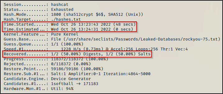 由于这是一个缩短的列表,我们仅用 48 秒就完成了整个过程,并且成功恢复了 1/2 个密码!
