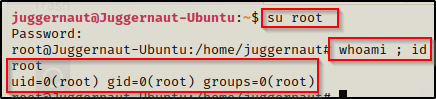 我们需要测试是否可以将用户切换为 root 用户。为此,我们只需使用su root,然后在提示时输入密码,最终我们就会得到 root shell。