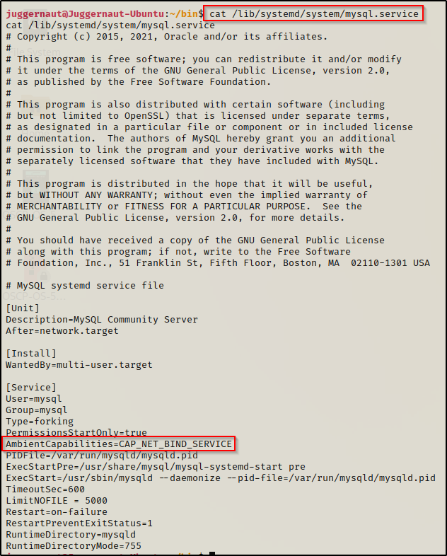 找到感兴趣的服务后,使用cat命令查看服务文件并查找AmbientCapabilities。