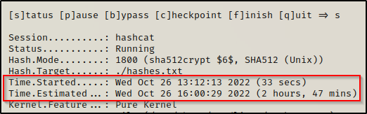 随着破解的开始,我们很快就会发现这种哈希类型的破解速度并不是最快的。例如,这两个哈希大约需要 2.5 小时才能破解整个单词表。