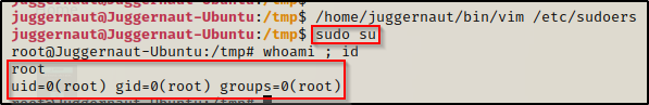 举个例子,当我们以用户 juggernaut 的身份立足时,我们不知道他们的密码。此外,在枚举过程中,我们发现 juggernaut 属于 sudoers 组。问题是,默认情况下,要使用 sudo su 并成为 root,我们需要知道当前用户的密码。这时,编辑 sudoers 文件就派上用场了。