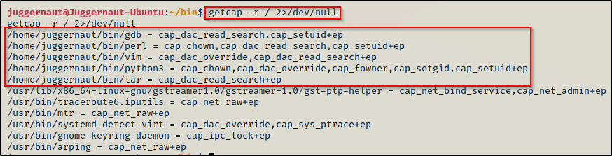 需要注意的是,我们需要使用二进制文件的绝对路径,或者cd到包含二进制文件的文件夹并使用 ./ 符号来执行我们的命令。由于设置了 capabilities 的二进制文件是原始二进制文件的副本,如果我们使用相对路径来执行它们,它将遵循 PATH 变量并最终执行默认的二进制命令而非设置了capabilities的命令。对于这些示例,我们将使用绝对路径来 100% 确保我们使用的是正确的二进制文件。此示例中的二进制文件位于 Juggernaut 用户家目录中下的名为 /bin 的自定义文件夹中。